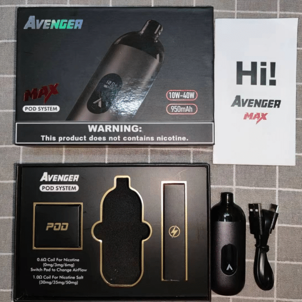AVENGER MAX復仇者大煙套組,搭載950mAh電池,支援8W-40W可調功率與Type-C快充,配備5ml大容量油倉,適用0.6Ω與1.0Ω霧化芯,提供穩定霧化與個性化吸煙體驗,輕巧便攜,滿足日常使用需求。