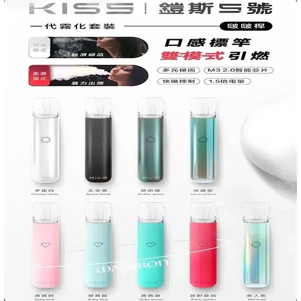 KISS 5 鎧斯5號可以通用電子煙煙彈:SP2S * ILIA * YK1 * TOLETROY * NTONE * CYONO *Kiss主機以其時尚多色選擇和實用的兩段式火力調節功能受到用戶喜愛。便捷的操作和Type-C快速充電介面確保了優質的吸煙體驗。一款結合時尚與實用的理想電子煙 霧化機。電子煙001-30