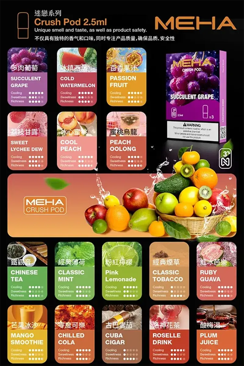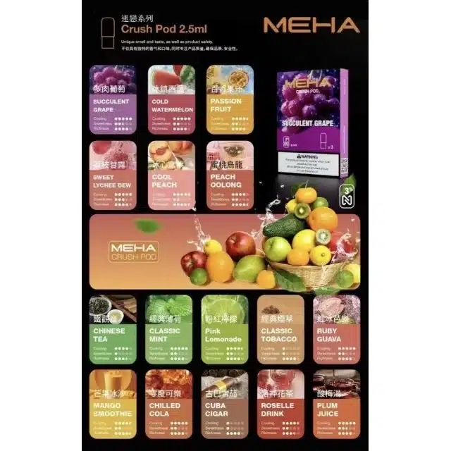 MEHA魅嗨煙彈,16種口味任選,單顆容量2.5ml,適配五代主機。限時活動:買五盒即送主機一台(方型主機)!